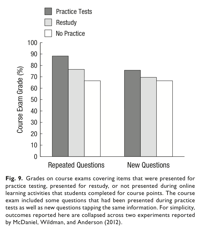 Another instance is that 4 blocks of study with practice tests outperformed 8 blocks of study without (39% vs 17%).
